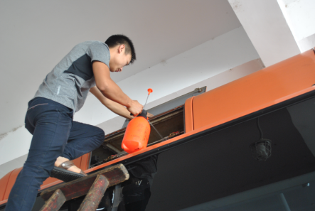 圖為修理人員正在對營運(yùn)車輛車載燃?xì)怃撈窟M(jìn)行維護(hù)