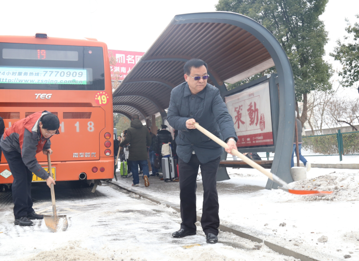 隨后,何董事長一行來到公交總站站臺,看望慰問了堅守在一線工作崗位上的公交員工及駕駛員,并親自帶領(lǐng)集團各位領(lǐng)導在站臺進行鏟雪除冰。在何董的督導支援下,在場的公交干職員工們備受鼓舞、干勁十足,勢要打贏這場抗雪防凍攻堅戰(zhàn),為常德市民出行安全保駕護航。