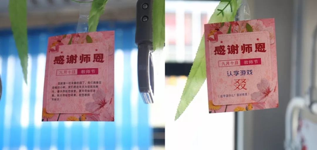 9月10日教師節(jié),一輛47路公交車內(nèi)掛滿的生僻字和教師節(jié)祝??ㄆ顺丝蛡兊淖⒁?。