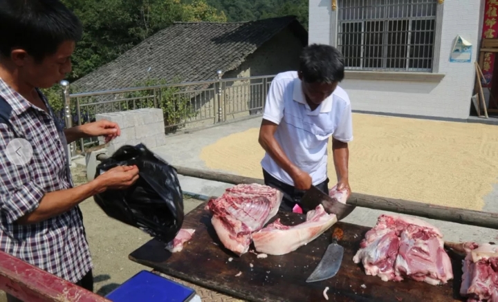 圖為竹兒嶺社區(qū)農(nóng)戶在分割土豬肉