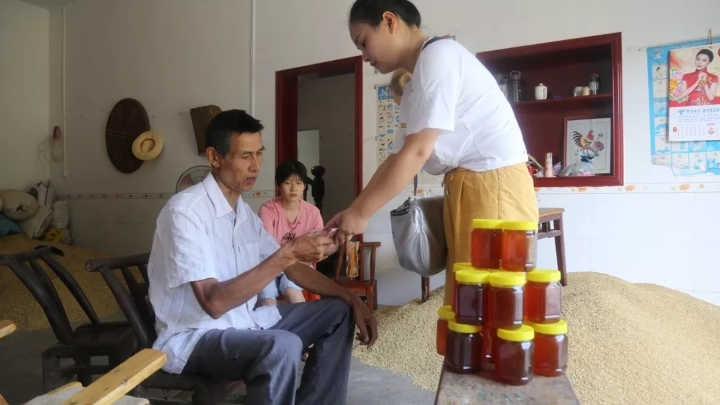 圖為公司工會(huì)辦負(fù)責(zé)人正在結(jié)對幫扶對象家中購買蜂蜜