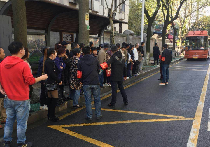 圖為公司管理人員在13路線首發(fā)站開(kāi)展客流督導(dǎo)工作
