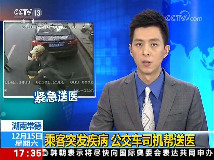 12月13日上午,常德市1路線公交車廂內(nèi)一名女乘客突發(fā)急癥,駕駛員楊建平在征得車廂內(nèi)其他乘客同意后,火速開車將其送往醫(yī)院并墊付醫(yī)藥費(fèi)。15日下午,這一暖心善舉在央視13套《新聞直播間》進(jìn)行了播報(bào),弘揚(yáng)了社會(huì)正能量。