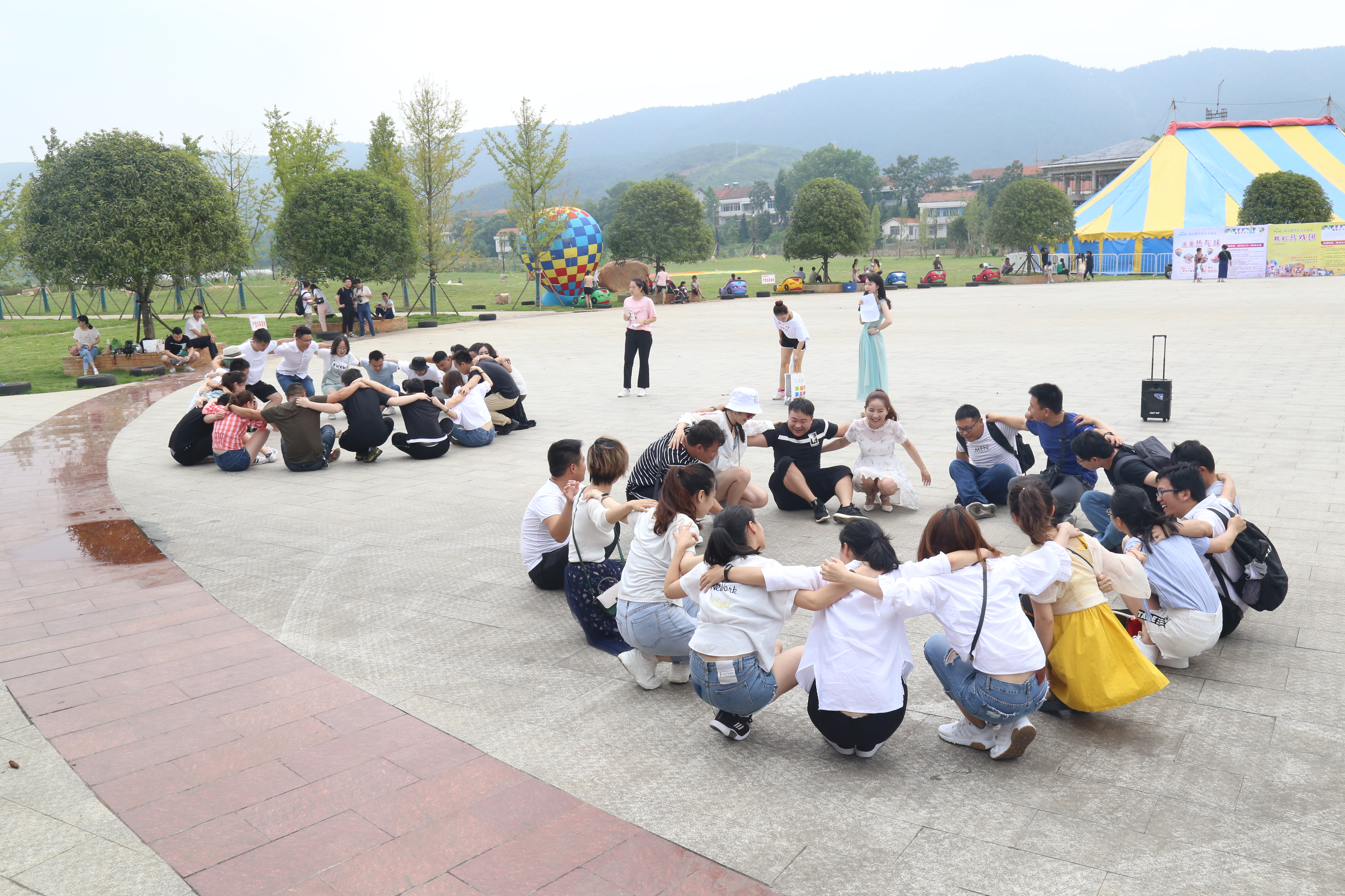 圖為青年員工們正在進(jìn)行“壘地起身”游戲